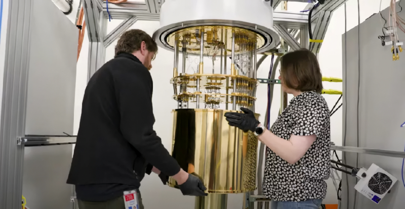 Um criostato no Laboratório de Computação Quântica do Google em Santa Bárbara, Califórnia, mantém um processador quântico operando próximo ao zero absoluto (Fonte: Google)