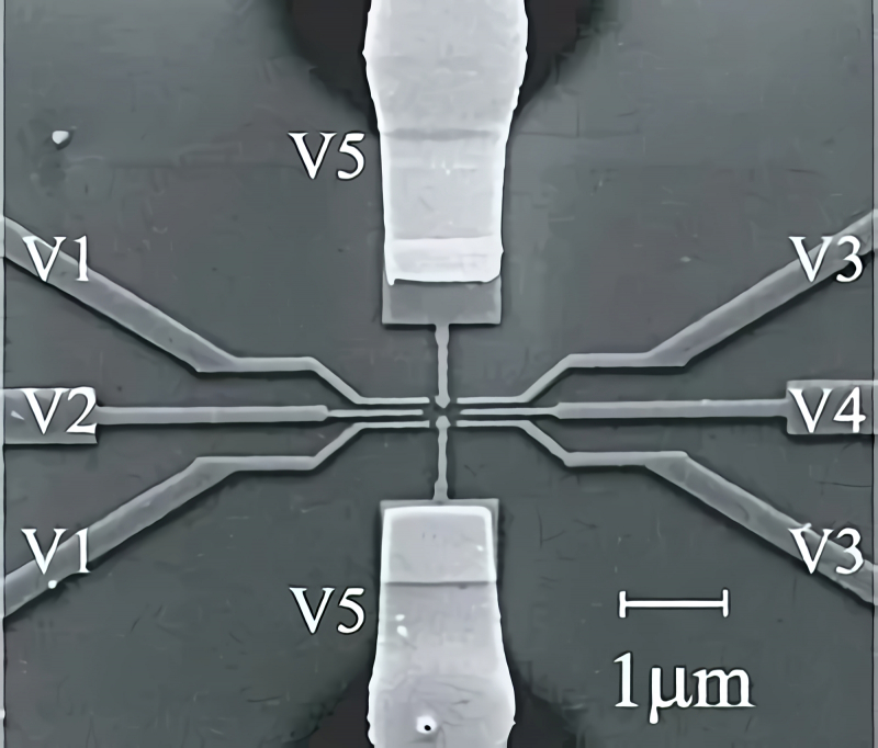 Fotomicrografia (1 μm = segmento de escala de 1000 nm é mostrado) da área de trabalho de uma configuração experimental com um par de pontos quânticos semicondutores (fonte: Duke University)
