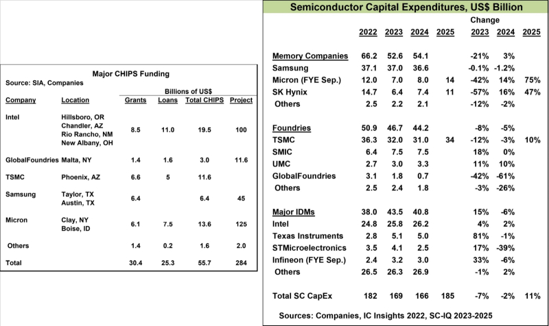 Esquerda: Principais beneficiários de doações e empréstimos da Lei CHIPS dos EUA em julho de 2024, mostrando cidades e estados onde suas fábricas estão planejadas. À direita: Despesas de capital das principais empresas de semicondutores do mundo em 2022-2023. mais uma estimativa para 2025, se disponível, em bilhões de dólares americanos, bem como sua dinâmica anual em% (fonte: Semiconductor Intelligence)
