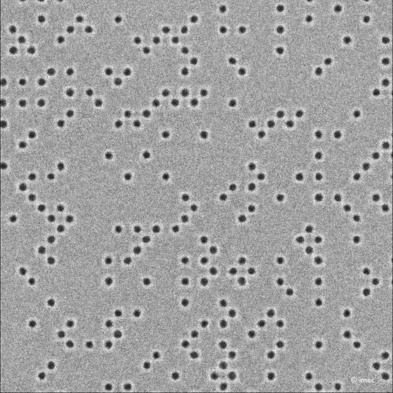 Os furos passantes, feitos em uma única passagem em um chip semicondutor em uma fotolitografia EUV de 0,55 NA, estão localizados extremamente próximos (a distância mínima entre seus centros é de 30 nm) e exatamente de acordo com o padrão pretendido (fonte: ASML, Imec)