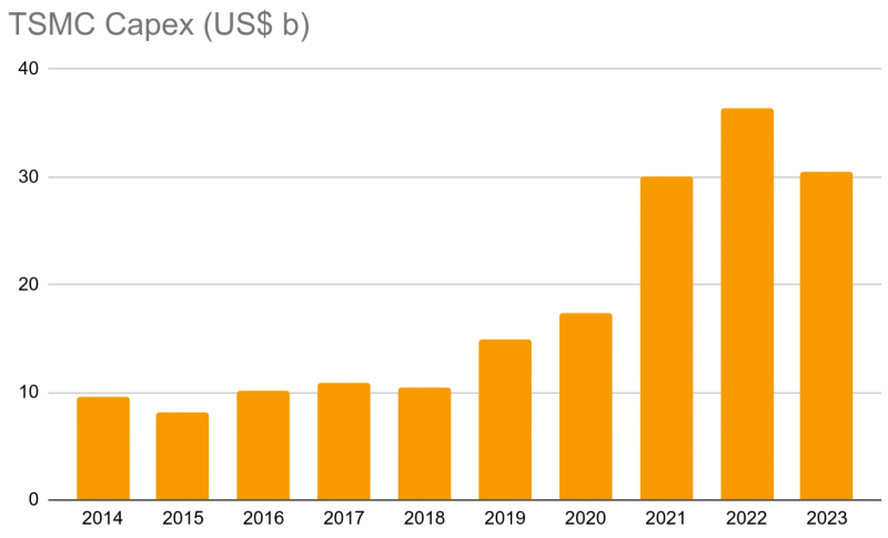 Despesas de capital da TSMC por ano, bilhões de dólares americanos (fonte: Bloomberg)