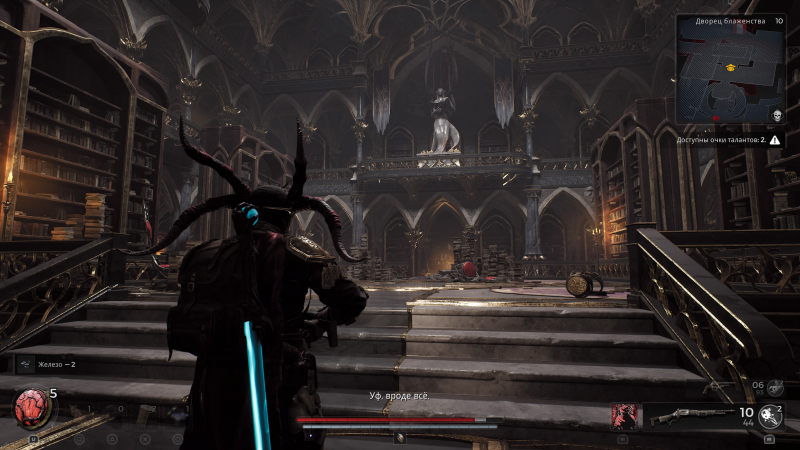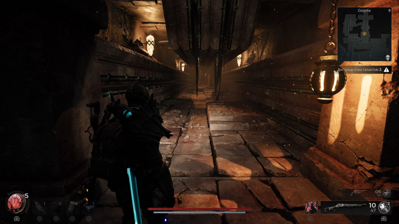Por se tratar de uma alma, o personagem principal não pode viver em paz – se você ficar boquiaberto por um segundo, morrerá imediatamente. Passei pelo jogo no Veteran (este é o segundo dos três níveis de dificuldade disponíveis no início), e o excesso de confiança é punido instantaneamente aqui. O protagonista ainda tem dois canhões e uma arma branca em seu arsenal, mas esta última é usada apenas em casos mais extremos – é muito melhor manter distância e atirar de volta. Se o oponente estiver muito próximo, acertá-lo com uma espada ou machadinha nem sempre é correto – na maioria das vezes é desejável rolar para o lado. Você precisa fazer isso a tempo – se você se esquivar um segundo antes ou depois, não será capaz de evitar danos.
