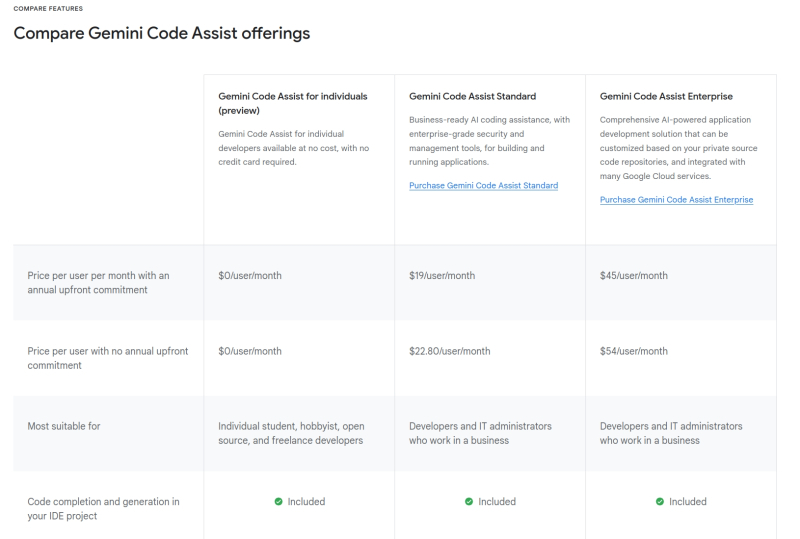 Entre os planos tarifários para usar o Gemini Code Assist, um totalmente gratuito realmente apareceu – este assistente de IA está disponível nas plataformas Visual Studio Marketplace, JetBrains Marketplace, GitJub Marketplace ou Firebase (fonte: captura de tela do site Codeassist.google)
