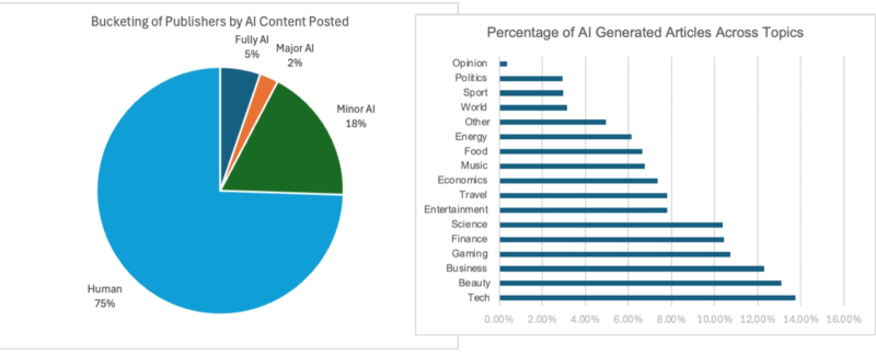Três quartos dos materiais de notícias textuais na Web em inglês são gerados inteiramente por pessoas e, em termos da participação daqueles na criação dos quais a IA está envolvida, pelo menos em grau mínimo, o líder – o que não é de todo surpreendente – é o tema tecnologia/tecnologia (fonte: Pangram Labs)
