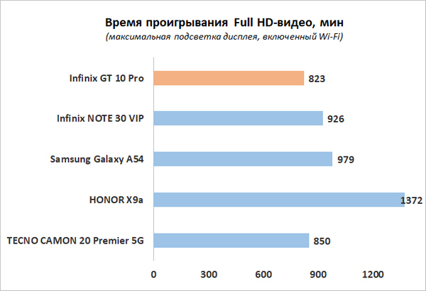 O Infinix GT 10 Pro recebeu uma bateria com capacidade de 19 Wh (5000 mAh, 3,8 V) – uma escolha padrão para um smartphone com parâmetros semelhantes. Assim, a autonomia é esperada – ao realizar tarefas normais e com carga normal, o gadget vive silenciosamente o dia todo. Para nós, o mais importante é que o GT 10 Pro perceba a carga do jogo com bastante normalidade – você não conseguirá jogar no seu smartphone o dia todo sem recarregar, mas a carga não derrete diante de nossos olhos, como acontece com outros dispositivos .