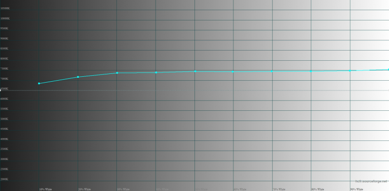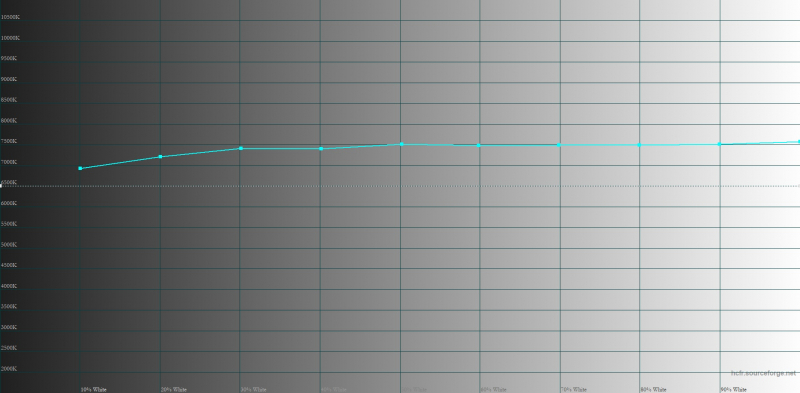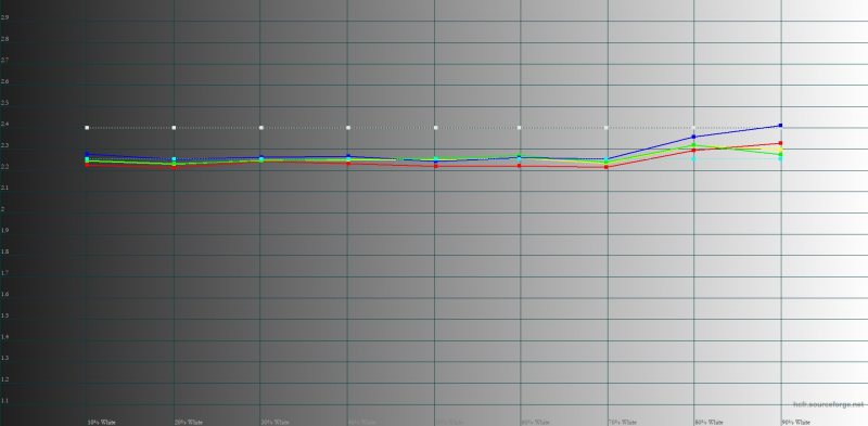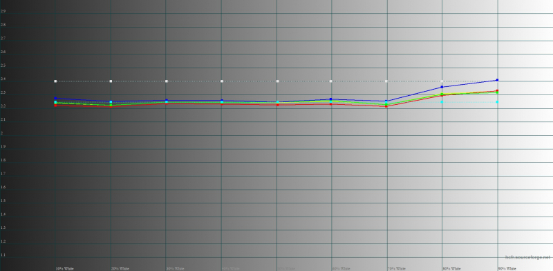 No modo “Cor Original”, configurado por padrão, a gama de cores corresponde ao padrão DCI-P3, quase sem deslocamento. A gama está próxima do normal (2,25), as curvas sobem ligeiramente em tons claros. A temperatura da cor aumentou, mas não muito significativamente – 7.000-7.500 K com um padrão de 6.500 K. O desvio médio DeltaE na escala Color Checker, que inclui uma ampla gama de cores e tons de cinza, está dentro do razoável: 3 .45 quando a norma é 3,00.