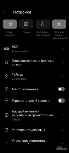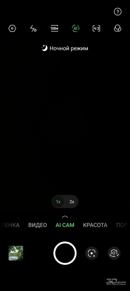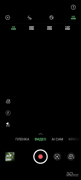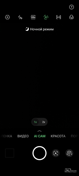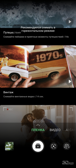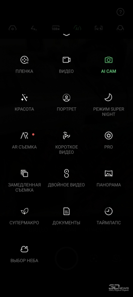 O aplicativo da câmera é implementado de maneira padrão – um carrossel horizontal de modos, os adicionais são chamados puxando um submenu da borda inferior. Há um modo de disparo manual e colagem de clipes (modo “Filme”), e disparo com máscaras de realidade aumentada, e o modo mencionado acima com substituição do céu na foto, e a capacidade de fotografar nas câmeras traseira e frontal em o mesmo tempo. O fabricante não criou uma interface especial para o aplicativo de câmera da série GT.