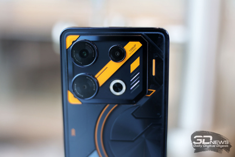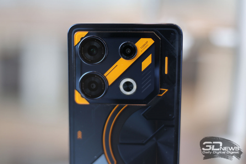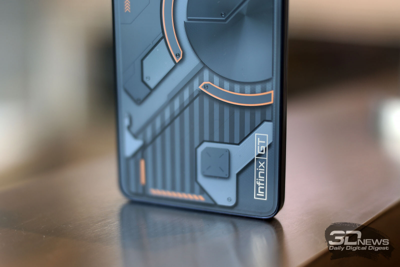 Mas mesmo sem iluminação adicional, o smartphone parece impressionante – se você, é claro, for um conhecedor desse tipo. Pelo menos o efeito da superfície multicamadas na área traseira com uma tampa transparente é claramente mantido. Ao mesmo tempo, o bloco da câmera, se tirarmos o enfeite de alta tecnologia, é o mesmo do Infinix NOTE 30 VIP: um par de lentes exageradamente grandes, uma câmera menor e um flash anelar com quatro LEDs. Se encaixa no estilo especial do smartphone GT, esta unidade é ótima.