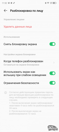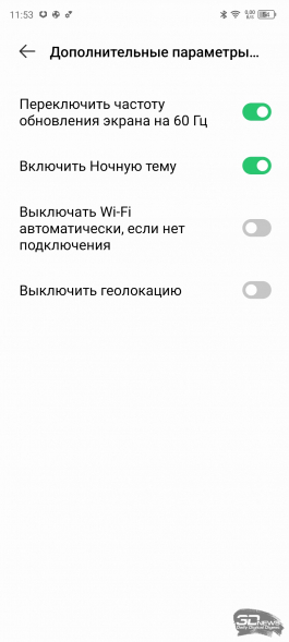 Existem muitas configurações de exibição. Há, claro, controle de brilho, inclusive adaptativo, quando o smartphone ajusta sozinho dependendo da iluminação – não recomendo usar esta opção, é melhor configurá-la imediatamente para o máximo. Também estão disponíveis o já mencionado ajuste de frequência, o modo “proteção ocular” com cores quentes, adequado para ligar antes de dormir, um tema escuro que não permite economizar energia em um smartphone com tela LCD, mas agrada apenas aos olhos e altera o tamanho da fonte. No local também está o modo “Pocket”, que reduz a sensibilidade da camada de toque do display para evitar ações acidentais com ele.