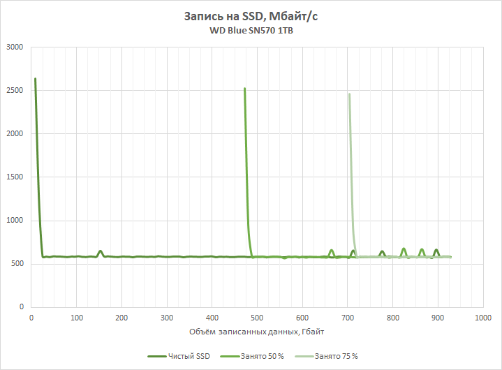 O cache SLC no WD Blue SN570 funciona de acordo com um algoritmo estático. Para gravação acelerada, possui uma pequena parte fixa da memória flash alocada. Por exemplo, uma unidade de 1 TB tem uma capacidade de armazenamento de aproximadamente 12 GB. Dentro desse volume, a velocidade de gravação single-thread atinge 2,6 GB/s e, em seguida, ao alternar para a gravação de dados no modo TLC, cai para 580 MB/s. Este é um resultado muito baixo, além disso, mesmo a unidade anterior da série, Blue SN550, demonstrou a melhor velocidade de gravação no modo TLC por uma vez e meia. Em outras palavras, a atualização do WD Blue SN570 com a transferência para a memória BiCS5 não foi muito bem sucedida em termos de desempenho ao gravar grandes quantidades de arquivos.