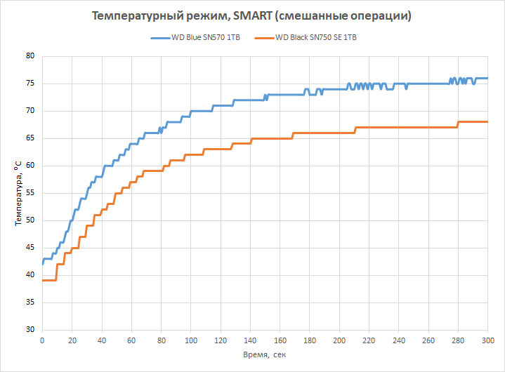 No entanto, é impossível julgar sua temperatura pelas leituras das utilidades. Tanto o WD Black SN750 SE quanto o WD Blue SN570 subestimam suas temperaturas no SMART em cerca de 10-15 graus, portanto, com o monitoramento do software, seu aquecimento parece ser muito pequeno, o que não é totalmente verdade. No gráfico abaixo, mostramos as temperaturas que o SMART retorna com uma carga de cinco minutos no SSD.
