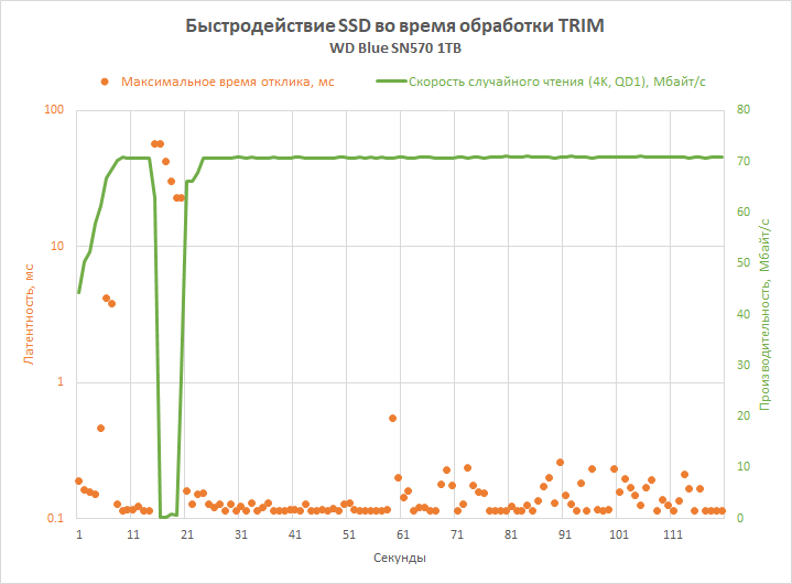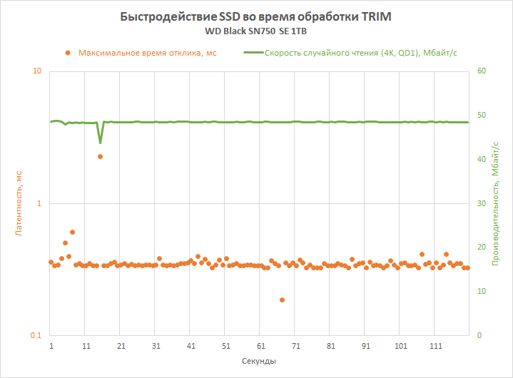 Mas o WD Black SN750 SE, baseado no controlador Phison PS5019-E19T, distingue-se por uma rara capacidade de processar operações de exclusão de arquivos sem cair em estupor por vários segundos. O gráfico a seguir mostra o desempenho de leitura aleatória e a latência imediatamente após apagar oito arquivos de 8 GB cada de um SSD. O tamanho e o número de arquivos não importam muito aqui – uma queda de desempenho é causada pela execução do comando TRIM, que segue qualquer operação de exclusão de dados. Mas o WD Black SN750 SE quase não é afetado por esse efeito: ele tem apenas um aumento insignificante e de muito curto prazo na latência.