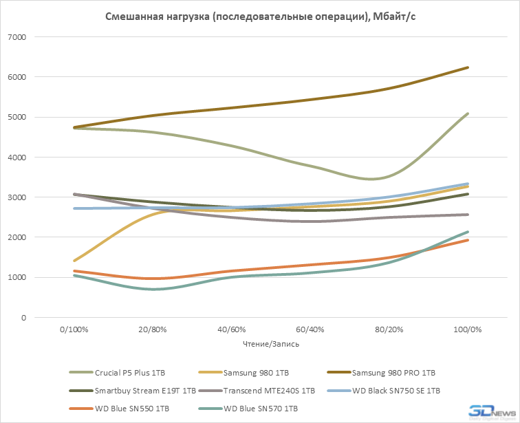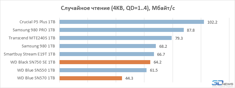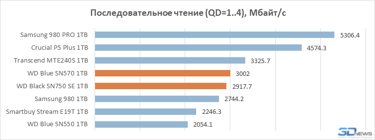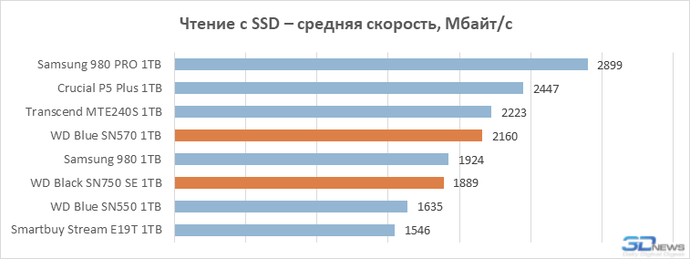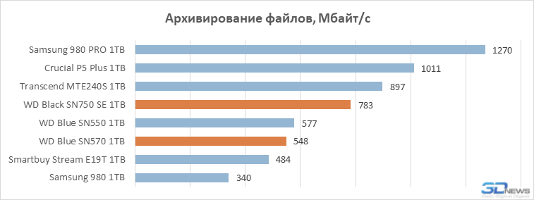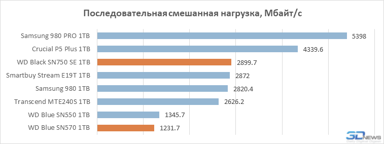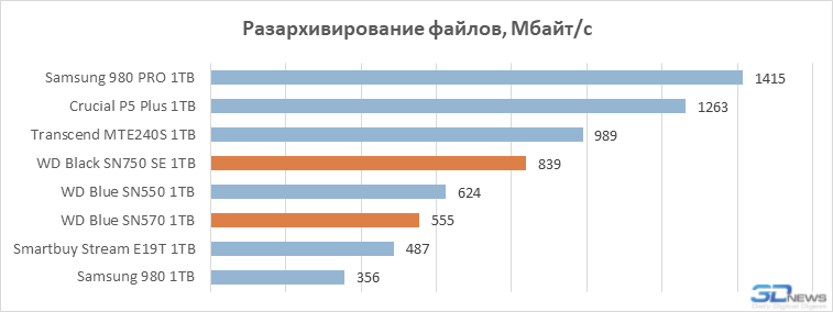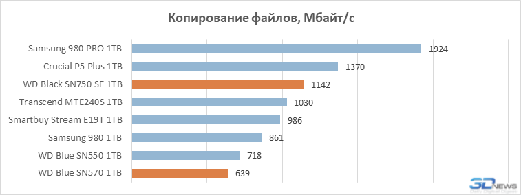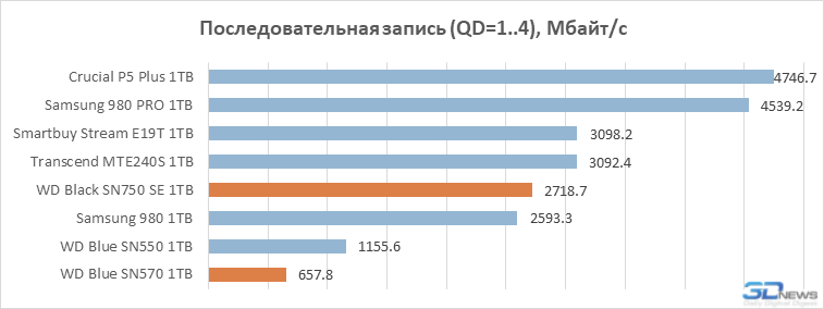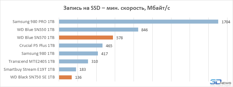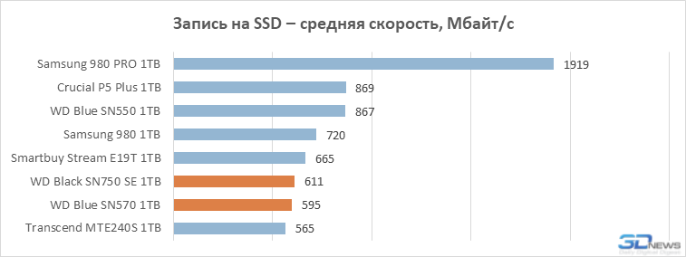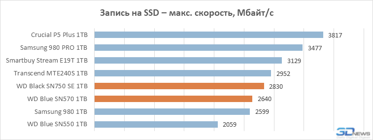 Devido à tecnologia dinâmica de cache SLC, o WD Black SN750 SE parece visivelmente melhor durante as operações de arquivo dentro da unidade do que o WD Blue SN570. E, em geral, o WD Black SN750 SE nesta disciplina acaba por ser o líder entre as opções sem buffer de orçamento – ele também supera o Samsung 980. Velocidade de gravação em flash.