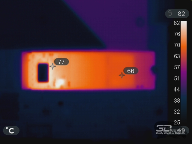 O WD Black SN750 SE acabou sendo um pouco mais frio – a temperatura máxima do controlador Phison PS5019-E19T era de 77 graus e a memória aqueceu apenas 66 graus.