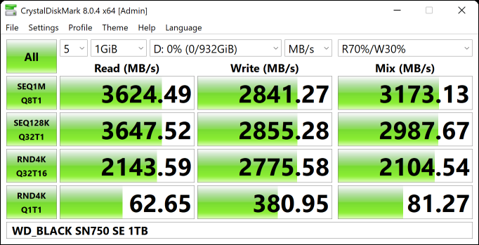 As medições de desempenho máximo da versão de terabyte WD Black SN750 SE no CrystalDiskMark, que fazemos para verificar a exatidão das especificações, confirmam que este SSD no controlador Phison PS5019-E19T realmente funciona no mesmo segmento que o WD Blue SN570.