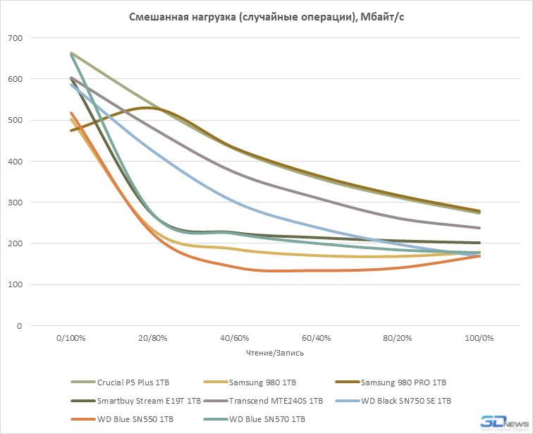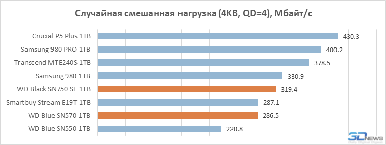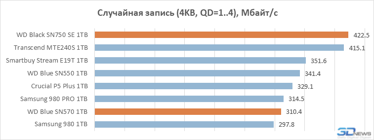 Unidades com design sem buffer não podem oferecer bom desempenho em leituras de blocos pequenos e operações mistas devido ao seu design. Mas o WD Black SN750 SE e o WD Blue SN570 também não se destacam no fundo das unidades em sua categoria de peso. O único caso de carga em que um dos novos produtos da Western Digital conseguiu mostrar um bom nível de desempenho foi a gravação aleatória.
