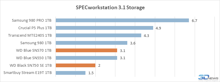 Essa situação se reflete em todos os cenários SPECworkstation, exceto no Energy, que simula o funcionamento de pacotes de software exóticos usados na indústria de petróleo e gás. No entanto, em qualquer caso, unidades NVMe completas com seu próprio buffer DRAM e uma matriz de memória flash de oito canais são muito mais adequadas para uso profissional. Mesmo o barato Crucial P5 Plus supera o WD Blue SN570 em mais de 1,5 vezes nos resultados do SPECworkstation.