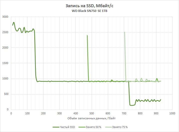 O WD Black SN750 SE tem um desempenho muito melhor no mesmo teste. Nele, o cache SLC funciona de maneira diferente, de acordo com um algoritmo dinâmico, de modo que cerca de 150 GB de informações podem ser gravadas em uma unidade limpa em alta velocidade. A velocidade de gravação ao mesmo tempo atinge 2,6 GB / s, mas depois que o volume do cache se esgota, cai para 900 MB / s, o que, no entanto, é muito bom para um SSD construído em um controlador de quatro canais. É verdade que, como mostra o teste, o algoritmo de cache SLC dinâmico do Black SN750 SE é eficaz apenas em um SSD puro. Depois de preencher a capacidade de armazenamento com dados pela metade, o volume do cache é fortemente compactado e apenas alguns gigabytes de dados podem ser gravados em um SSD parcialmente ocupado em alta velocidade.