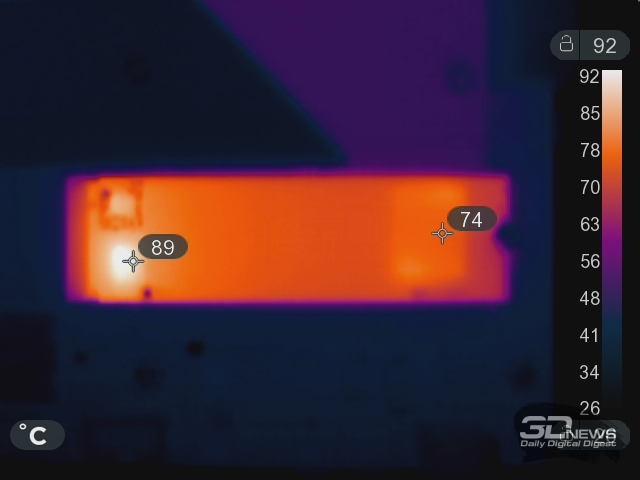 No WD Blue SN570, o controlador atingiu uma temperatura de 89 graus durante uma carga de cinco minutos e o chip de memória aqueceu até 74 graus.