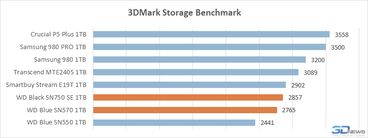 Separadamente, notamos que o WD Black SN750 SE aquece mais fraco em comparação não apenas com o WD Blue SN570, mas também com unidades de referência baseadas no mesmo controlador Phison PS5019-E19T. Ou seja, os engenheiros da Western Digital conseguiram otimizar não apenas o desempenho, mas também a eficiência energética dessa plataforma.