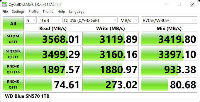 Temos a variante Blue SN570 de 1 TB para teste. Medir suas velocidades de pico com o teste CrystalDiskMark garantiu que os números especificados na especificação não fossem exagerados.