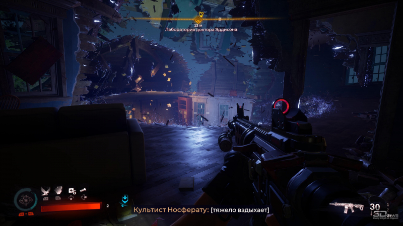 Com o tiro, tudo também é deplorável. Quando os oponentes percebem o jogador e tentam atirar nele, eles não ficam mais espertos: os atiradores ficam parados e olham para a mira, mesmo que você corra até eles, cultistas armados com metralhadoras ocasionalmente se escondem atrás de coberturas. Os vampiros acabam sendo oponentes um pouco mais interessantes – eles se teletransportam pelas costas, movem-se com rapidez e facilidade para fechar a distância. Para derrotá-los, você deve primeiro colocar algumas balas e depois acabar com elas com uma estaca colada no canhão. Este não é um “truque” muito conveniente, porque se você disparou de uma pistola, então você precisa mudar para uma metralhadora ou uma espingarda para finalizar, mas você se acostuma.
