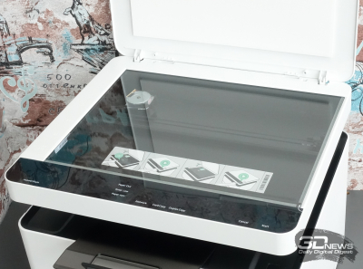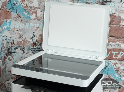 A MFP está equipada apenas com um scanner de mesa, que tradicionalmente fica localizado na parte superior do gabinete. A tampa do scanner abre em um ângulo de 90 graus e, se necessário, tem a capacidade de subir acima do vidro para digitalizar livros ou documentos encadernados com várias páginas. É verdade que sobe apenas um centímetro, por isso será difícil digitalizar livros grossos.