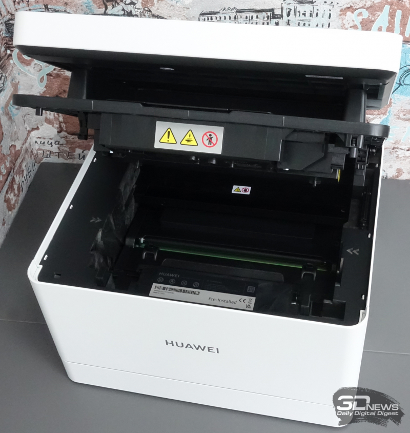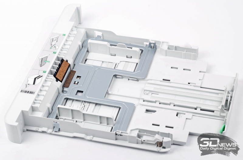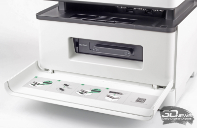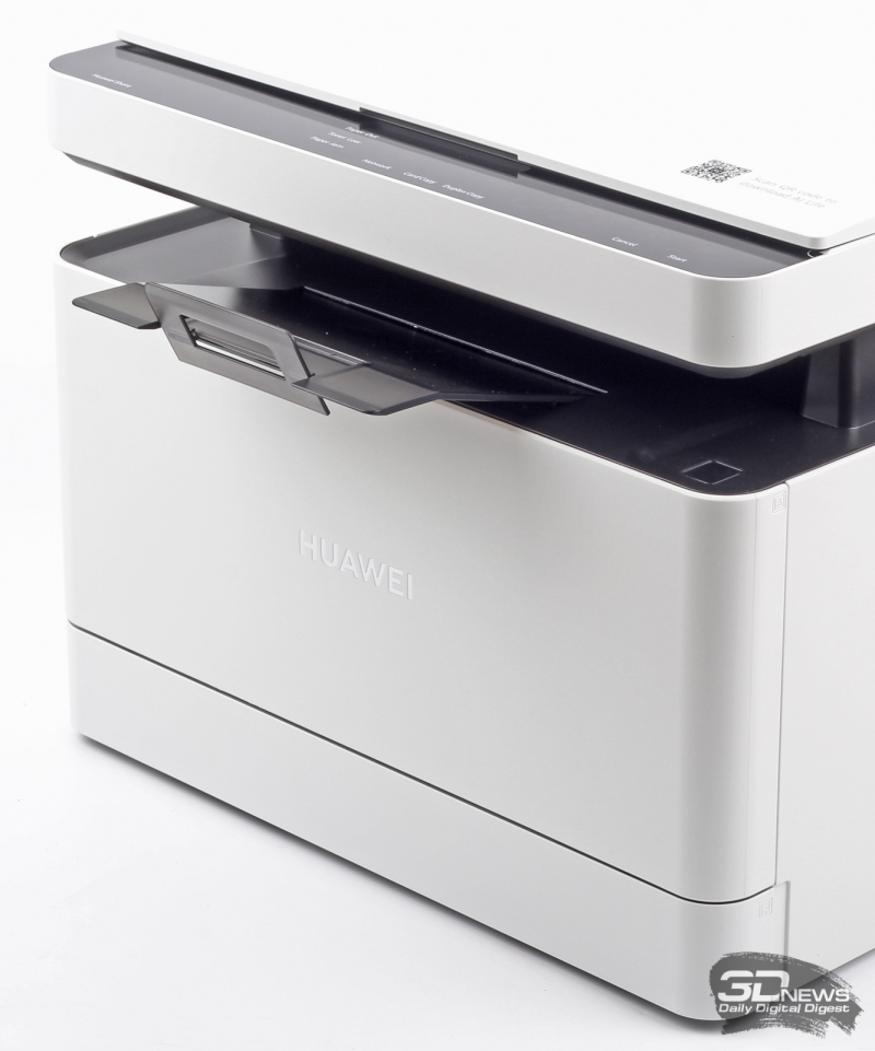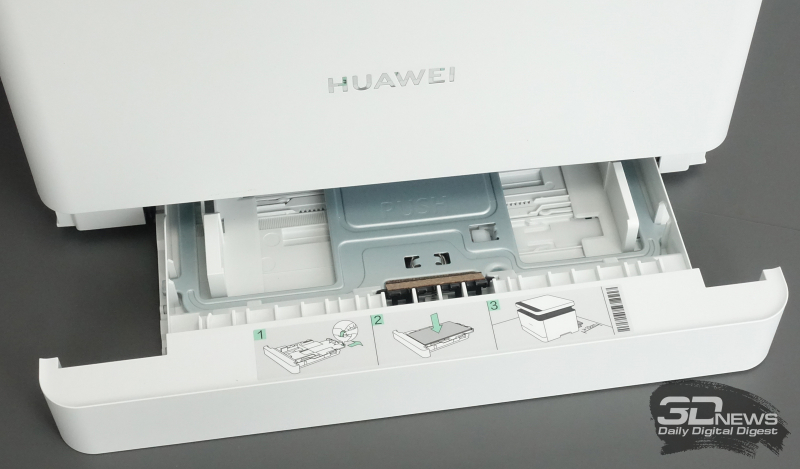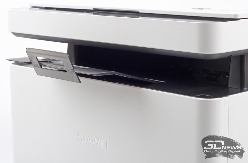 O layout do MFP é clássico. Na parte inferior da caixa há uma bandeja de alimentação plástica retrátil de 150 folhas. O mecanismo de elevação do papel na bandeja é feito de metal e a parede traseira se afasta para empilhar folhas A4. Quando estendida, a parede traseira da bandeja sobressai das dimensões da parte inferior do gabinete em um pouco menos de 10 cm, como outros MFPs de dimensões semelhantes. Mas o HUAWEI PixLab X1 não possui uma bandeja de alimentação adicional, portanto, toda a mídia de papel é carregada em uma única bandeja inferior. É daí que vem a restrição de densidade da mídia: esta impressora não é adequada para imprimir em papelão grosso e em geral papéis com densidade superior a 105 g/m2.