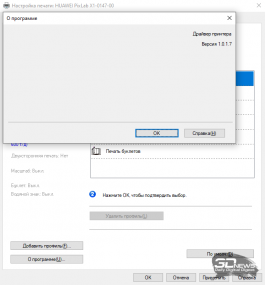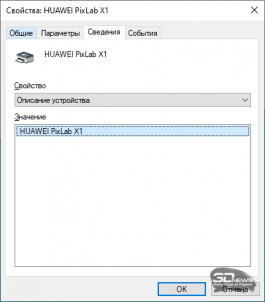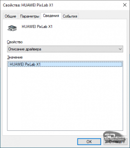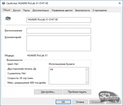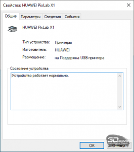 Após a instalação, um novo dispositivo HUAWEI PixLab X1 apareceu na seção de impressoras conectadas, mas não conseguimos obter informações sobre o tipo de driver instalado. Na seção correspondente das propriedades da impressora, não foi encontrada nenhuma informação sobre este assunto.