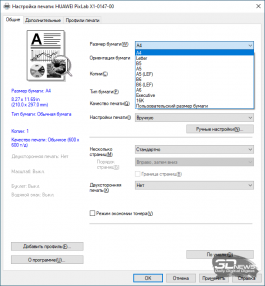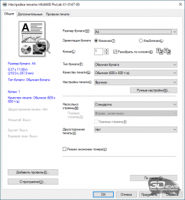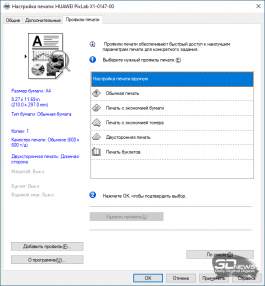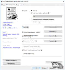 Todas as configurações podem ser salvas em perfis separados, que posteriormente podem ser conectados rapidamente durante a impressão. Além dos perfis recém-criados, já existem predefinições nas configurações da impressora: impressão com economia de papel ou toner, impressão de livretos e afins. Em geral, podemos afirmar que as configurações do usuário do HUAWEI PixLab X1 são suficientes para resolver qualquer tarefa, tanto em casa quanto no escritório.