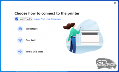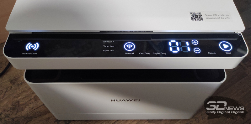 O principal trunfo do novo MFP é, obviamente, seu pacote de interface e a capacidade de integração ao ecossistema HUAWEI AI Life. Todos os dispositivos HUAWEI compatíveis podem ser conectados a este último e gerenciados por meio de uma única interface móvel. Para garantir uma conexão fácil e rápida do HUAWEI AI Life, bem como a capacidade de trabalhar com ele a partir de uma variedade de dispositivos, o fabricante equipou seu dispositivo com cinco interfaces diferentes: com fio (USB 2.0 e RJ-45 de 100 megabits) e sem fio (Wi-Fi 802.11 b/g/n, Bluetooth 5.0 e NFC). A comunicação Bluetooth é usada apenas para conectar a MFP, mas o módulo NFC é necessário para acesso rápido à impressora a partir de dispositivos móveis. Isso garante que você possa imprimir de um PC de mesa,