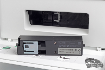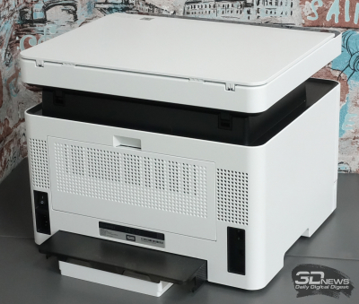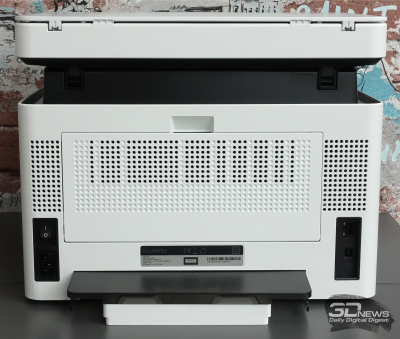 Todos os botões de controle no HUAWEI PixLab X1 são sensíveis ao toque, com exceção do botão de controle de energia localizado na parte traseira do gabinete. Ao lado, há um soquete padrão para conectar o cabo de alimentação. Apesar das dimensões relativamente pequenas do MFP, a própria fonte de alimentação está escondida dentro de seu gabinete. Bem, no canto oposto da parede traseira há uma porta USB-B para conexão direta da MFP à porta USB do computador, bem como uma interface de rede RJ-45 cabeada.