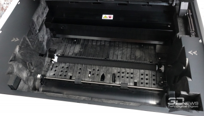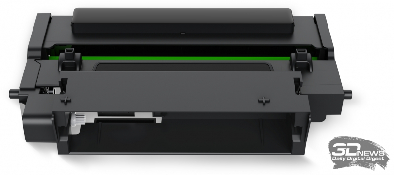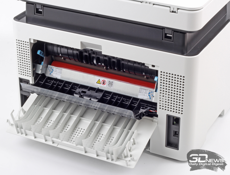 O cartucho do tambor não é muito mais difícil de alcançar. Para fazer isso, você precisa pressionar um botão quase imperceptível no canto da bandeja de saída e abrir a parte superior da impressora. Depois disso, você pode remover o cartucho. A MFP também fornece acesso a todos os outros elementos mecânicos. Para fazer isso, abra a parede traseira do gabinete.