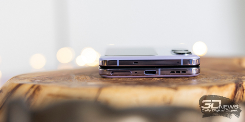 Se a imagem do OPPO Find N2 Flip estiver indo muito bem, o som está bom. A ausência de um mini-jack não surpreende ninguém, os alto-falantes são estéreo, onde, junto com o alto-falante na parte inferior, funciona um alto-falante. Além disso, o som dele também é emitido para a borda superior com a ajuda de um pequeno slot, para que a reprodução em segundo plano não pare e não vá para um alto-falante se você fechar a concha. A transmissão de áudio sem fio é realizada usando um módulo Bluetooth 5.3 com suporte para perfis de chave de alta resolução (aptX HD e LDAC).