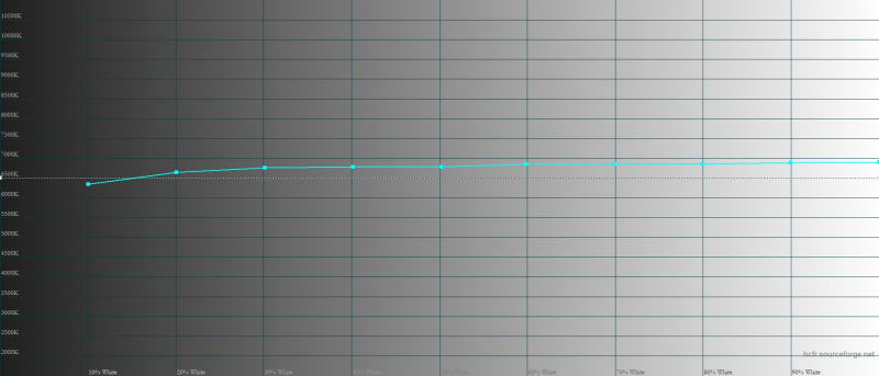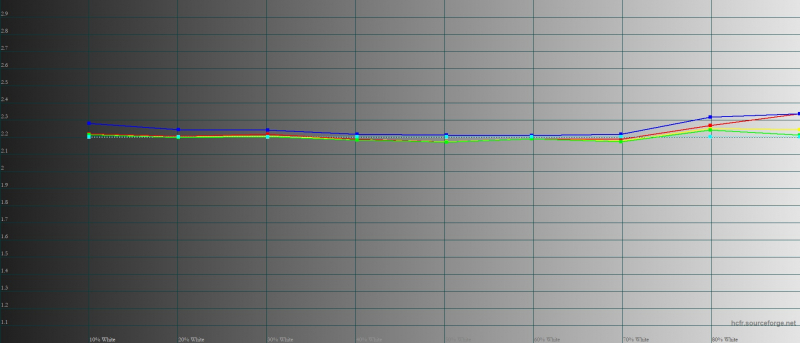 No modo “Natural”, o espaço de cores é reduzido ao padrão sRGB, mas com desvios um pouco maiores do padrão. A gama aumenta ligeiramente, atingindo um valor quase ideal (2,20), e a temperatura da cor, ao contrário, diminui, também se aproximando do padrão – 6.700-6.800 K. O desvio médio do DeltaE para a paleta estendida do Color Checker é 4,07 – inesperadamente maior desvio do que no modo “brilhante” mais frio.