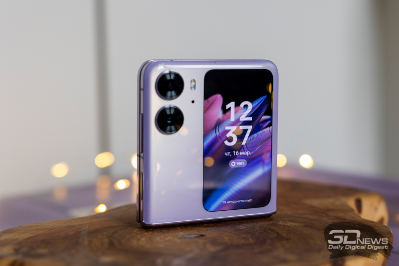 O formato desses smartphones, em princípio, é lido imediatamente – é uma concha clássica, mas em vez do esquema “tela + teclado”, uma tela com uma dobra no meio fica escondida dentro do gabinete. A OPPO não propõe nenhuma alteração no formato em si, mas está trabalhando nos detalhes. Em primeiro lugar, esse mesmo vinco no Find N2 Flip é discreto graças a uma dobradiça especial (que estreou no OPPO Find N). Além disso, esta dobradiça reduz o espaço entre as abas do smartphone quando dobradas. Em segundo lugar, possui a maior tela externa entre os clamshells de nova geração – 3,6 polegadas. Outra coisa é que esse trunfo também deve ser jogado adicionando uma tela de casos de uso para isso. Existem outros recursos, como a plataforma MediaTek Dimensity 9000+. Em geral, definitivamente há algo para falar.