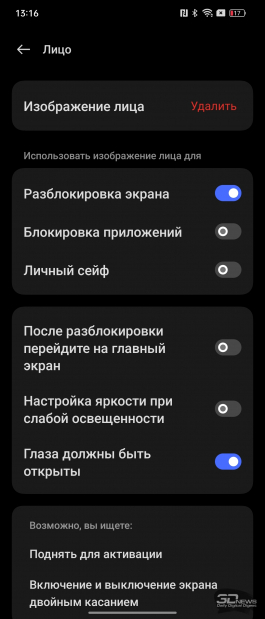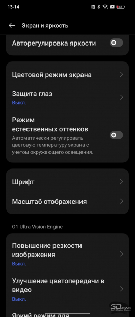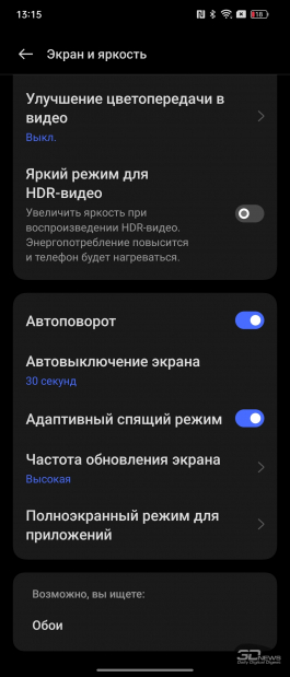 Nas configurações de exibição, você pode alterar o tamanho da fonte, definir o modo “proteção ocular” (um filtro azul que aquece a imagem e reduz o cansaço visual), ativar o modo de suspensão adaptativa (o smartphone não desliga a tela quando você olha nisso – como o Google Pixel). Existem muitas configurações para exibir informações na tela bloqueada e um conjunto de software de aprimoramento de imagem típico para smartphones OPPO: você pode aumentar a nitidez, expandir a gama de cores do vídeo SDR, aumentar o brilho ao reproduzir conteúdo HDR (aqui, talvez, o a tela atingirá seu brilho máximo de capacidade de design).