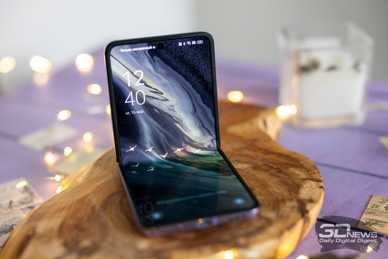 A tela interna do OPPO Find N2 Flip recebeu uma matriz padrão LTPO AMOLED com uma diagonal de 2520 × 1080 pixels. A densidade de pixels é de 403 ppi. Uma taxa de atualização aumentada de 120 Hz é suportada. A matriz é mais do que relevante, limitando-se apenas ao fato importante de que a tela está dobrando aqui, OPPO não. Embora, por exemplo, os ângulos de visão não sejam particularmente impressionantes – sim, a imagem permanece perfeitamente legível mesmo com um desvio extremo do olhar da perpendicular, mas as cores ficam levemente distorcidas, a imagem esquenta.
