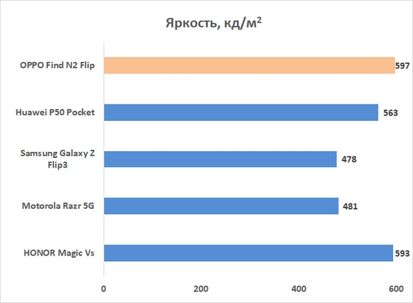 Medimos os parâmetros exclusivamente para a tela dobrável interna. O nível limite de brilho sem aprimoramento de software durante o ajuste automático, de acordo com nossos dados, é de 597 cd/m2. Longe dos 1600 cd / m2 declarados pelo fabricante, mas para as condições de medição (sempre as realizamos sob a luz artificial de lâmpadas incandescentes) é bastante normal. Quando a luz solar direta atinge a tela, a tela fica visivelmente mais brilhante em qualquer caso (mesmo que o auto-ajuste esteja desligado), você pode usar seu smartphone ao sol sem problemas. E sim, você pode esperar que o conteúdo HDR seja reproduzido pelo menos tão próximo de como os criadores o imaginaram.