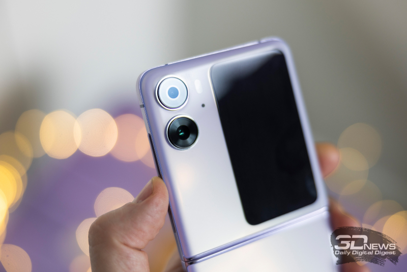 O OPPO Find N2 Flip possui duas câmeras traseiras. Isso pode surpreender em nossa época, quando menos de três já é algo indigno, mas, na verdade, o smartphone não difere nesse aspecto de outras garras atuais, que também receberam dois módulos cada, e de acordo com o mesmo esquema: com padrão e revisão de cantos estendidos.