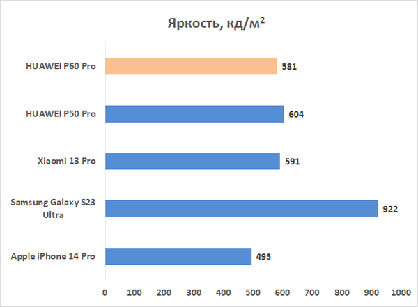 O nível de brilho limite medido sem um aumento de software durante o ajuste automático (a medição é realizada sob luz artificial de lâmpadas incandescentes) foi de 581 cd/m2. Um bom indicador para uma tela OLED está no sol e ao reproduzir conteúdo HDR, ainda cresce, mas aqui a tela do HUAWEI P60 Pro teve um desempenho um pouco pior do que a tela do HUAWEI P50 Pro.