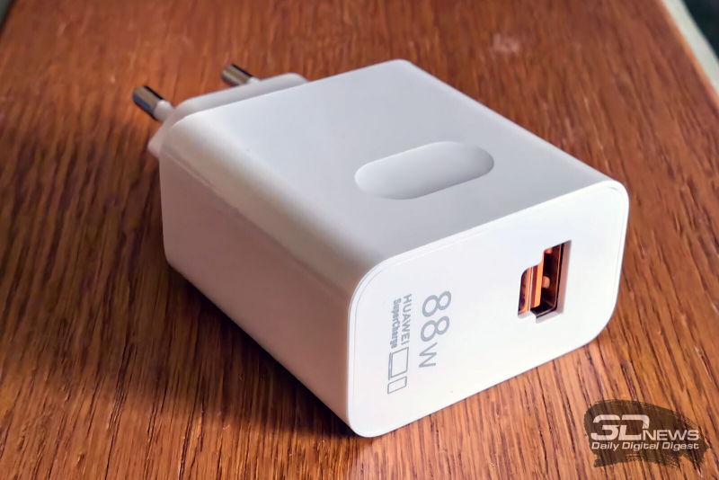 Para carregar, é utilizada uma porta USB Type-C (USB 3.1), o smartphone suporta carregamento rápido de até 88 W, o que permite carregar a bateria em cerca de 35 minutos (60% é carregado em 15 minutos). E neste caso, vamos até anexar uma foto do adaptador: em primeiro lugar, porque está incluído no kit e, em segundo lugar, porque é muito notável. Vemos duas portas nele – USB Type-C e USB Type-A, que permitem usá-lo para carregar um smartphone e um laptop HUAWEI. O poder para isso, como você sabe, é suficiente. Uma opção muito bacana.