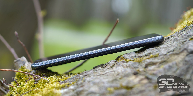 O bloco da câmera “se amontoa” no canto – não vou dizer que é bem modesto, mas tentando com todas as forças chamar a atenção. Porém, é claro que ele não ficará sem atenção – a câmara central o atrai com seu grande vidro. Essa é a primeira coisa que chama a atenção, e aí você já percebe que uma das três lentes é emoldurada por um oval. E o bloco em si é grande e se projeta fortemente acima do corpo. Sensores grandes requerem óticas grandes, que por sua vez requerem espaço adicional.
