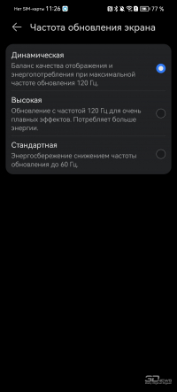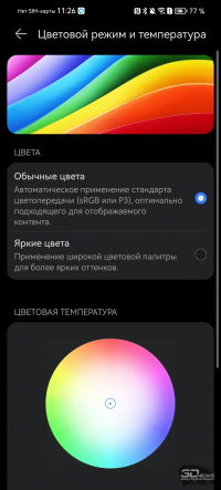 O conjunto de configurações de tela é típico de um smartphone com EMUI e bastante ruim: um nível ajustável de filtragem UV quando a temperatura da cor é reduzida, configurações de fonte e escala de imagem, ajuste de resolução, formato de interface escuro / claro, conteúdo SDR “adequado” para HDR. Noto a falta de autoajuste do tom da cor dependendo da iluminação – um parâmetro “flutuante” para HUAWEI, que desaparece das configurações dos smartphones da marca e depois retorna. Você pode alterar a reprodução de cores entre normal e brilhante, com a capacidade de ajustar a temperatura da cor por conta própria. Por padrão, o display funciona com cores normais. Medi a tela do P60 Pro em ambos os modos, com a temperatura de cor padrão.