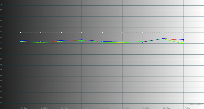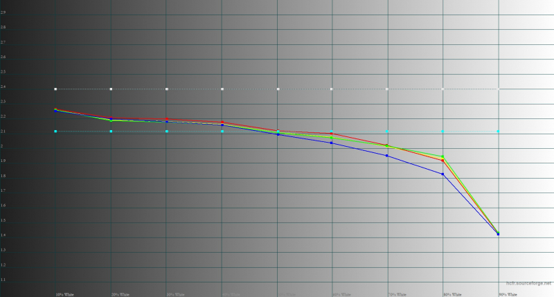 “No modo brilhante, a exibição é definida como mais desleixada, se você quiser. A gama média é reduzida (2,12) e as curvas em cores brilhantes diminuem drasticamente. A temperatura da cor, com o mesmo gráfico suave do modo normal, é aumentado para 7400-7 500 K, o desvio médio DeltaE de acordo com a tabela ColorChecker é 4,86. Observo também que no modo claro, apesar do nome, a tela produz um brilho máximo menor do que no padrão. Recomendo não tocar este modo.”