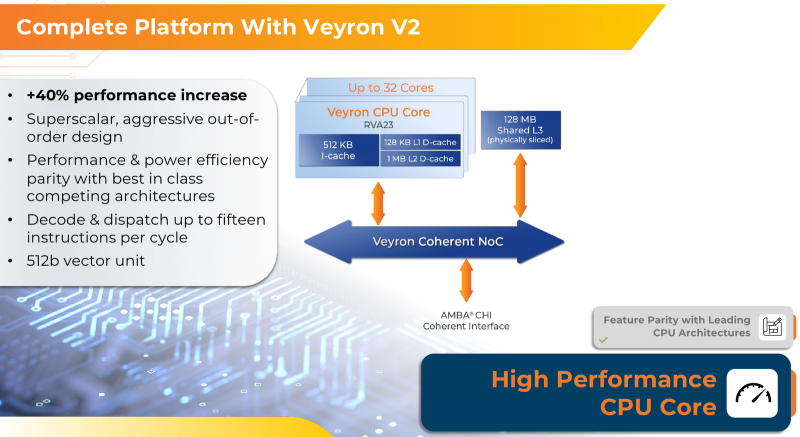 Tal como na primeira geração, a empresa de desenvolvimento continua a aderir ao conceito de “designer de processador” com design de chiplet. No centro do Veyron V2 de 4 nm ainda está o hub de E/S baseado em AMBA CHI, cobrindo controladores de memória e barramentos PCI Express, bem como blocos IOMMU e AIA. Os chips de computação são conectados a ele por meio da interface UCIe. A latência da conexão UCIe é inferior a 7 ns.
