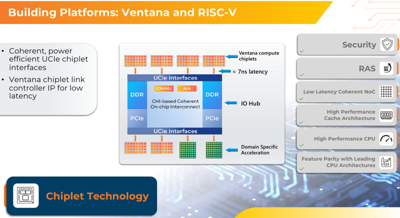 Esses chips podem ser de diferentes tipos: tanto com núcleos de uso geral (32 núcleos por chiplet), formando o próprio processador Veyron V2, quanto contendo coprocessadores específicos para uma tarefa específica (aceleração específica de domínio, DSA). Este último pode ser representado por FPGAs, aceleradores de IA, etc. Além disso, a pedido do cliente, a Ventana também pode otimizar o hub de E/S para melhorar a eficiência dos núcleos e coprocessadores da CPU.