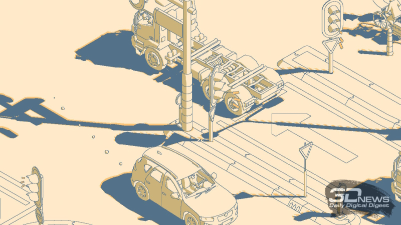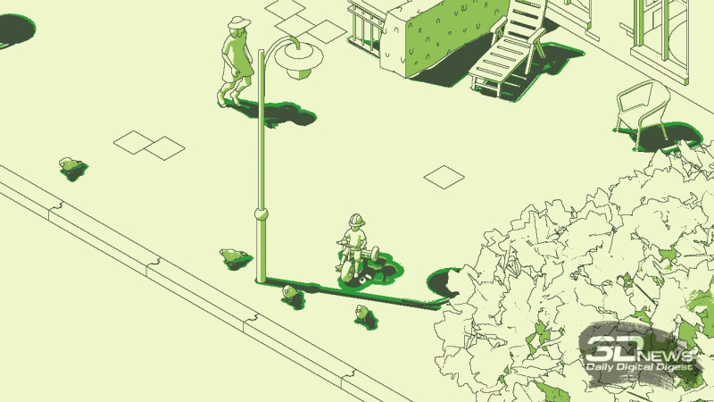 Às vezes é preciso aproveitar o momento e, por exemplo, pular na sombra dos transeuntes ou dos ciclistas que passam, ou criar você mesmo uma sombra ou organizar condições para um maior avanço. Afinal, você pode interagir com alguns objetos: digamos, levantar a lança de um guindaste para deslizar ao longo de uma sombra ampliada; manipule um semáforo para pegar uma carona na direção certa ou use um guarda-sol como catapulta para voar até uma sombra distante.