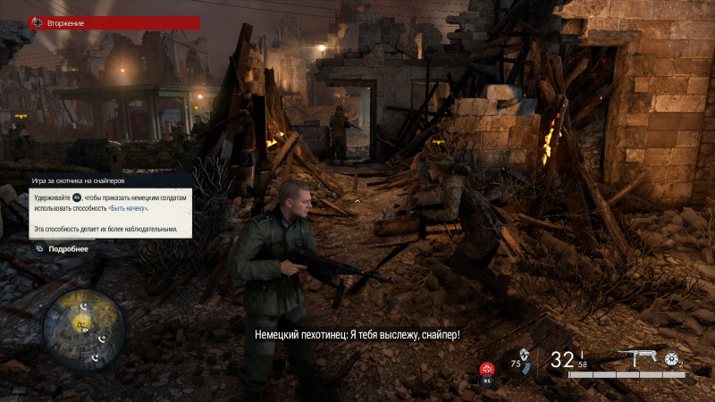 Todas essas não são as inovações mais importantes, e você provavelmente nem vai lembrar que parte disso não estava nos jogos anteriores da série. Muito mais importante não é o mais original, mas um grande novo “chip” – invasões. Uma mecânica que se encaixa em Sniper Elite ainda melhor que Dark Souls. O segundo jogador assume o papel de um lutador de elite alemão e se torna uma espécie de “caçador de atiradores” – ele deve encontrar Karl e derrotá-lo.