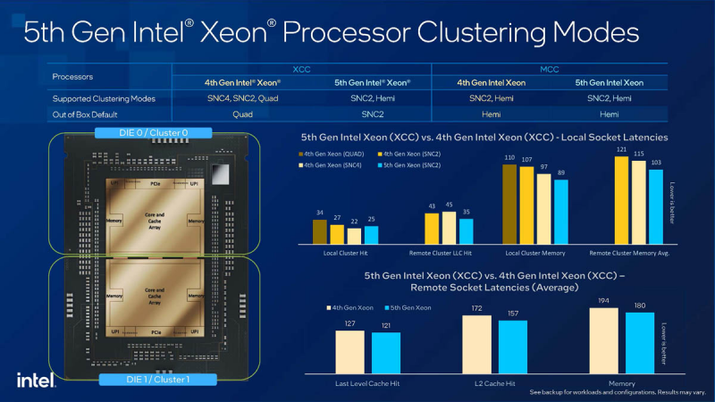 Mas a atenção especial às questões de latência parece completamente justificada: graças ao novo layout, usando dois blocos com três canais EMIB versus quatro blocos no Sapphire Rapids, onde os blocos diagonais entre si tinham que se comunicar entre si através de uma “parada” extra. o atraso foi reduzido significativamente. Os modos NUMA SNC4 e Quad agora, por razões óbvias, não são suportados nem mesmo para o layout XCC, onde o modo SNC2 está habilitado por padrão.